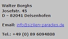 Fotos: Die verwendeten Bilder auf der Webseite stammen aus dem eigenen Bestand oder aus kostenpflichtigen Quellen, für die wir eine Nutzungsgebühr entrichtet haben. Die Bilder sind mit einem Quellenvermerk jeweils entsprechend gekennzeichnet. Grundsätzlich werden Fotos oder Videos von Personen, die im Rahmen von Veranstaltungen oder Aktionen veröffentlicht werden, von uns ordnungsgemäß auf die Ausnahmen des KunstUrhG §22 und §23 geprüft. Sollten Sie dennoch mit einer Veröffentlichung eines Fotos auf der Webseite nicht einverstanden sein, teilen Sie uns dies unter der Adresse info@sizilien-paradies.de mit. Wir werden die Sachlage umgehend prüfen.